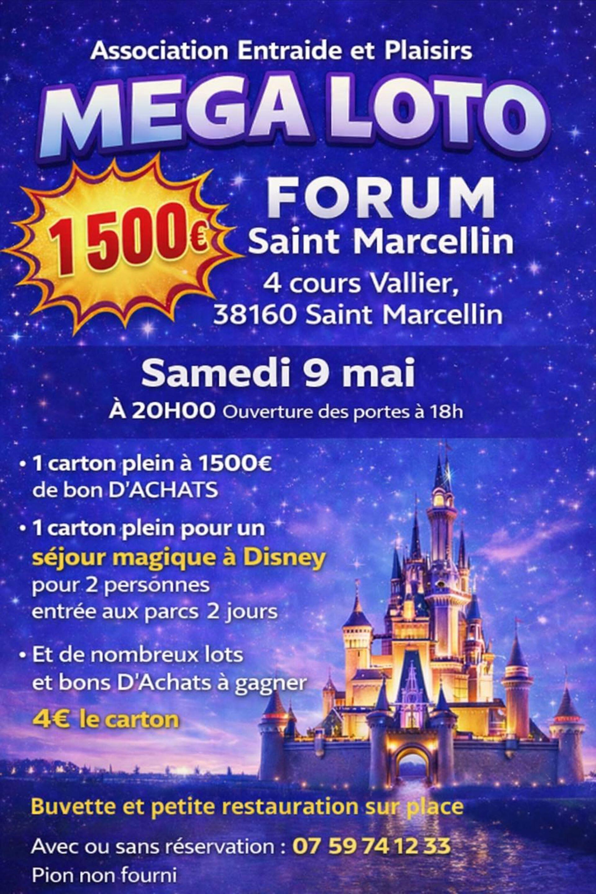 Organisé par l'Association Entraide et Plaisirs - nombreux lots à gagner, dont un bon d'achats de 1500€ et un séjour magique à Disney pour 2 personnes. Avec ou sans réservation. Buvette et petite restauration sur place. 4€ le carton, pion non fourni.