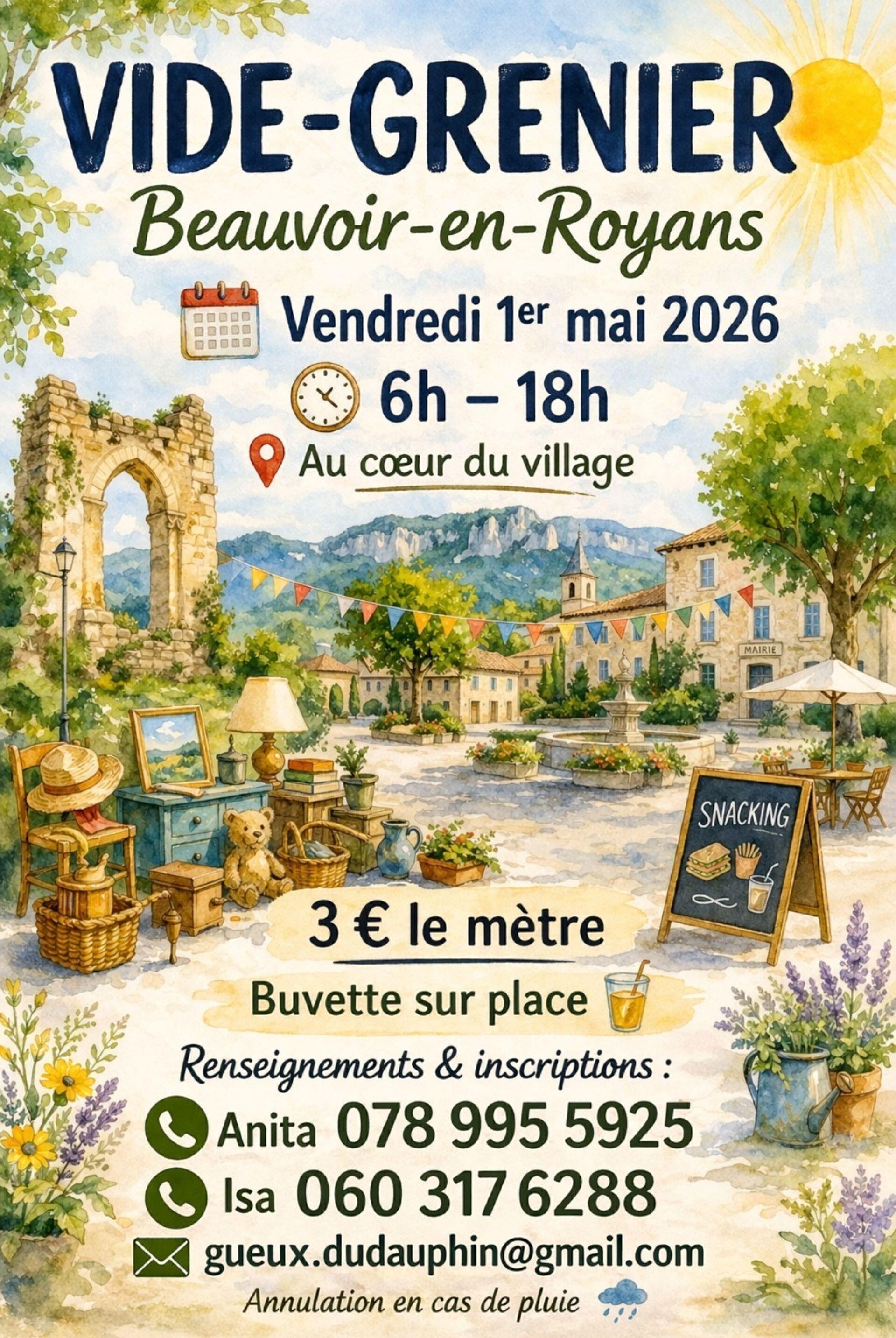 Venez chiner et découvrir de nombreux trésors lors du vide-grenier de Beauvoir-en-Royans. Profitez également d'une buvette et d'un service de snacking pour vous restaurer tout au long de la journée. En cas de pluie, l'événement sera annulé.
